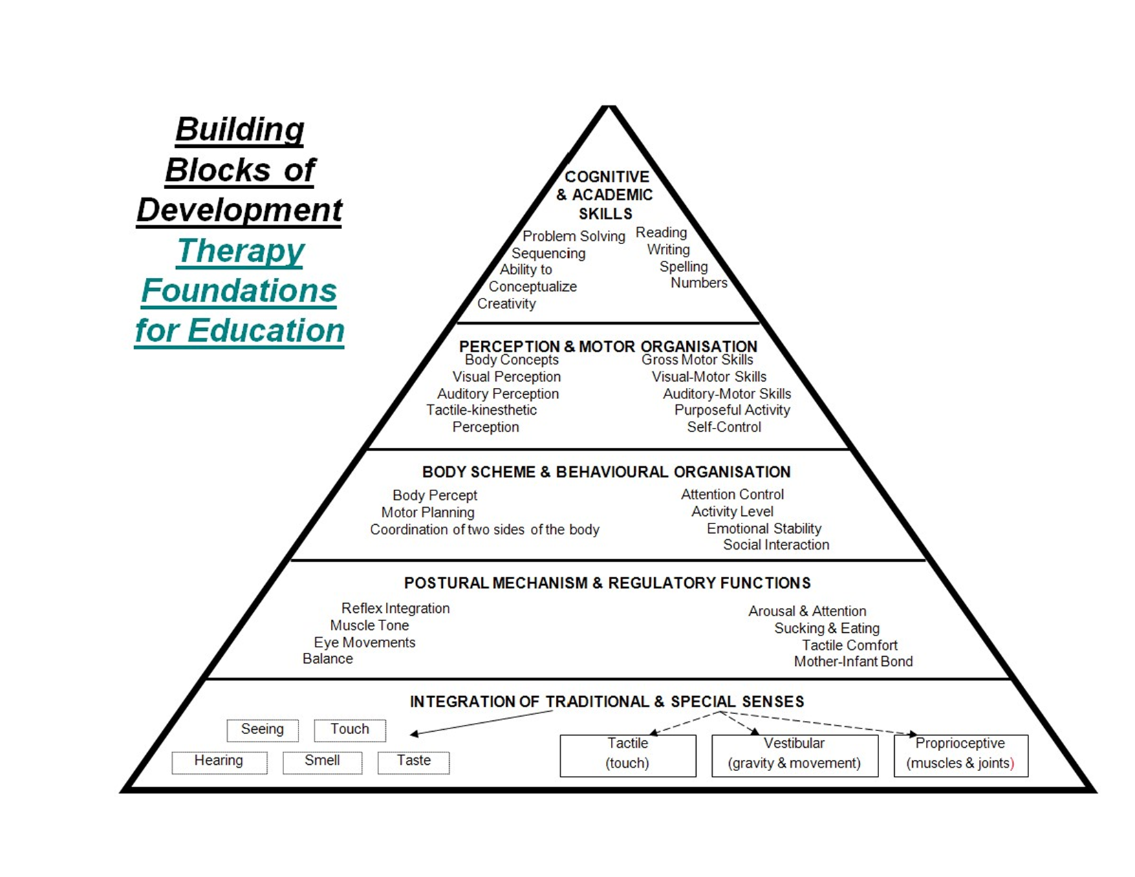 The Developmental Pyramid is a visual representation that shows how foundational skills support every aspect of development and daily functioning. When any of these underlying systems are disrupted, it can negatively impact a child’s ability to build more advanced skills and reach their goals.